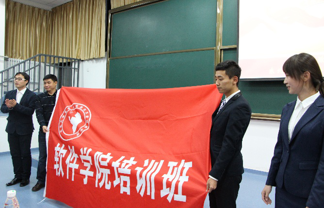 闫研在开班仪式上致辞,他从青马培训的意义出发,立足于大学生现状,提出“培养符合当前双创时代特色的、信仰坚定的IT精英”的观点。希望全体学员能够成为社会主义核心价值观的践行者、引领者、传播者,成为新时代的弄潮儿。最后,刘春风为本期青马工程学员代表授旗,宣告软件学院第九期“青马工程”正式启动。