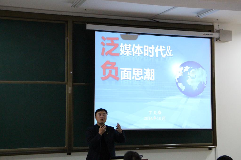 11月2日晚6时30分,东北大学党委宣传部部长丁义浩于信息学馆A308室为第九期青马学员带来“泛媒体时代和负面思潮”主题讲座,青马学员悉数到场。