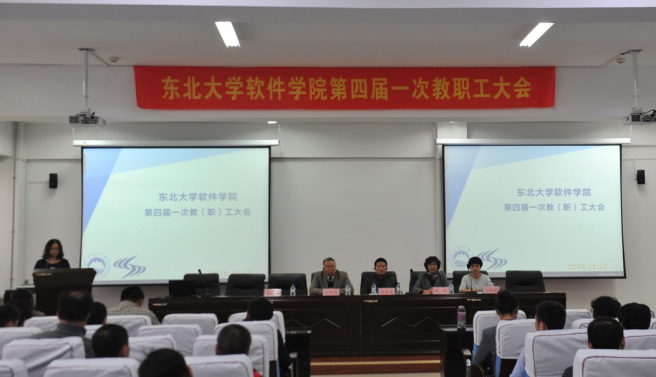 2016年11月17日,软件学院在浑南校区信息楼B520会议室召开了东北大学软件学院第四届第一次教职工大会,校工会副主席孙东来、工商管理学院工会主席辛冲、生命科学与健康学院工会主席黄学石出席会议。会议由院工会副主席杨萌萌主持,软件学院全体教职工全员参加了会议。