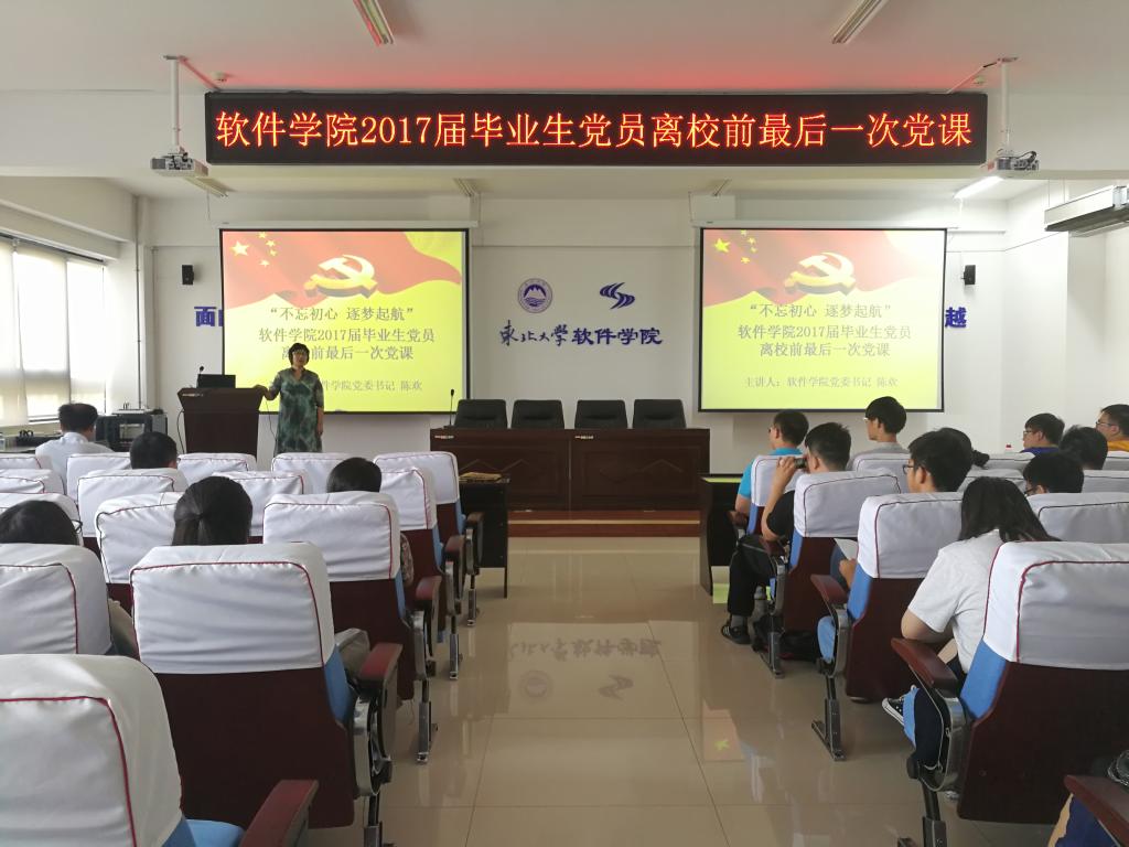 6月16日,软件学院学生党总支在浑南校区信息学馆B520室举行了2017届毕业生党员离校前最后一次党课。软件学院党委书记陈欢为毕业生党员做了“不忘初心 逐梦起航”专题党课。全体2017届毕业生党员出席活动,活动由党委组织员王海霞主持。