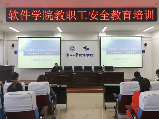 11月1日,软件学院在浑南校区信息学馆B520会议室开展了教职工安全教育培训,校安全管理委员会办公室主任尚子扬应邀作专题报告。学院领导班子成员及全体教工参加了此次培训。
