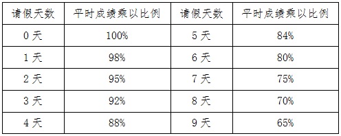(1)平时成绩占总成绩的50%,其中《东北大学软件学院实训阶段总结报告》成绩占10%、《东北大学软件学院学生实训验收成绩评定表》成绩占40%。另外,根据出勤请假情况对平时成绩进行调整,平时成绩乘以比例与请假天数关系如下: