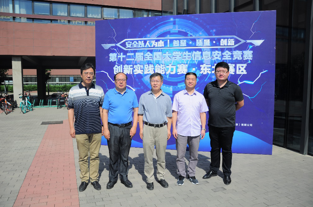 软件学院领导与嘉宾专家合影(右起依次为杭州安恒信息技术有限公司东北大区总经理赵君,中科院沈阳自动化研究所尚文利研究员,东北大学软件学院院长张斌教授,大赛组委会委员东北赛区负责人周福才教授,东北大学软件学院副院长程维副教授)