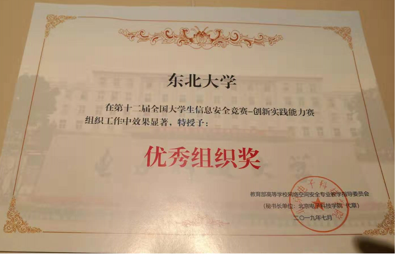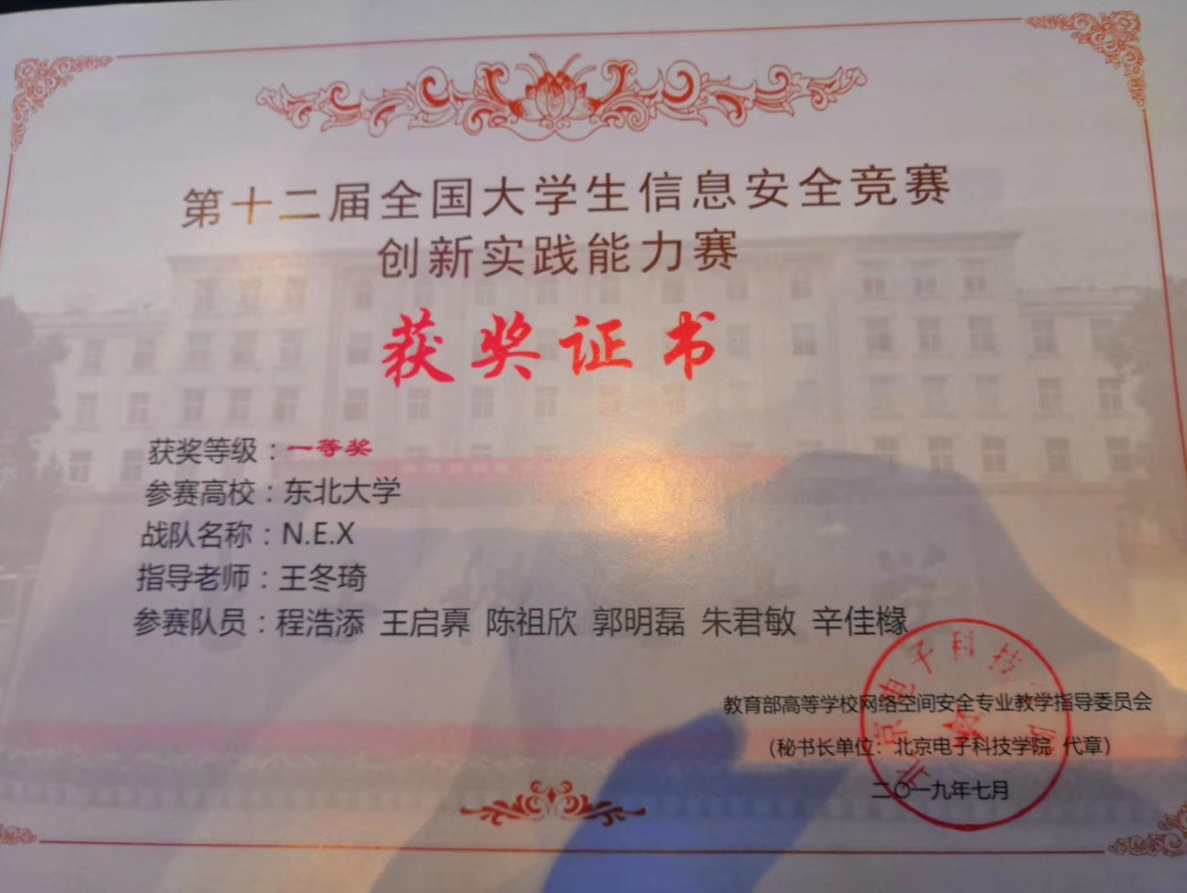 ‘全国大学生信息安全竞赛-创新实践能力赛’是目前国内最高级别的信息安全大赛之一,本届比赛全国共有455所高校,1316支队伍,6027名学生参赛,东北大学N.E.X战队以东北区冠军身份闯入决赛,并在总决赛80支队伍中最终成绩排名第12位,是我校乃至东北地区高校历年最佳成绩,东北大学因为在分区赛组织中的突出贡献被授予‘优秀组织奖’,N.E.X战队指导教师王冬琦老师被授予大赛的突出贡献奖。据悉,N.E.X战队不只面向计算机相关专业吸纳成员,全校所有专业学生都可以参与队员选拔。