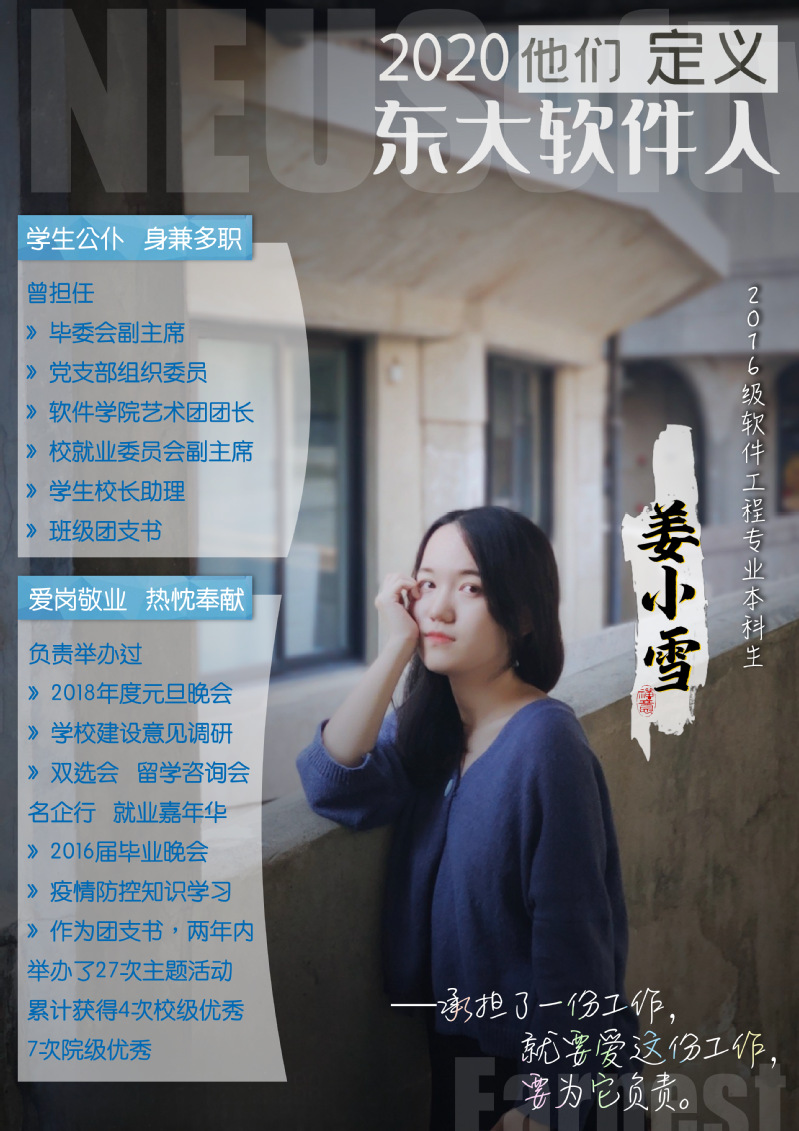忙碌的身影如音符悦动,活动精彩纷呈,工作会议不紊有条,你总是能看到她。大学四年里,从未耽误过任何一项工作,忙到再晚也从没有过一句怨言,是她,软件学院2016级本科生姜小雪。