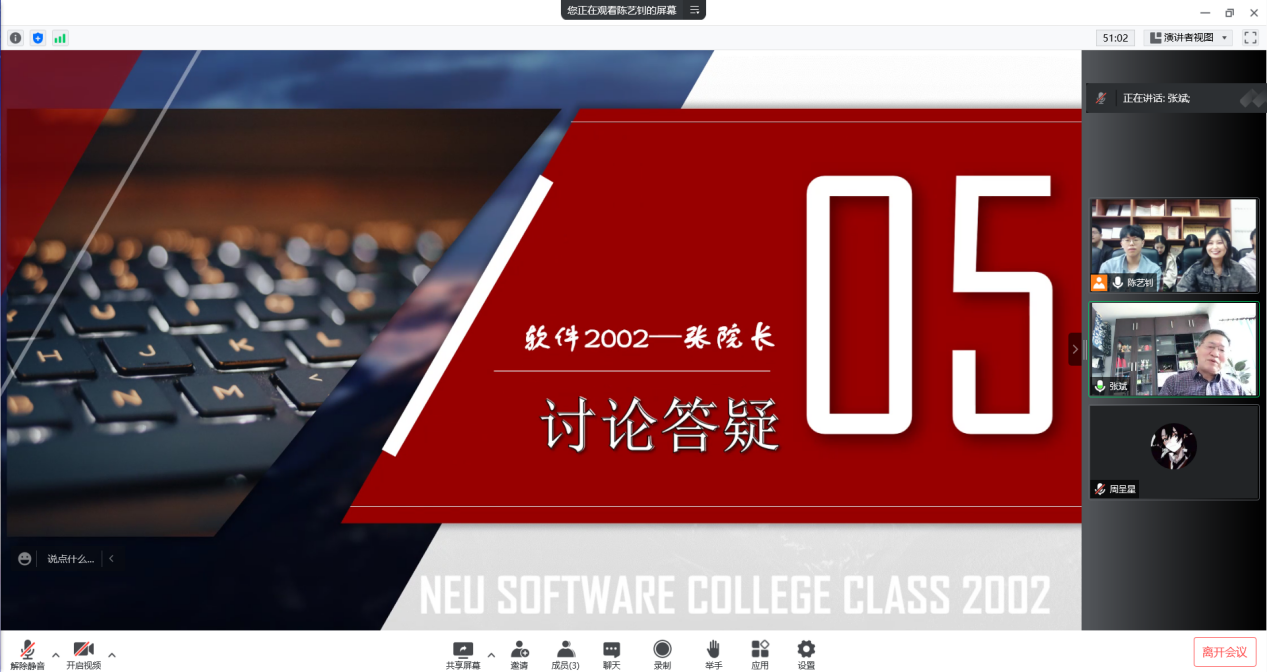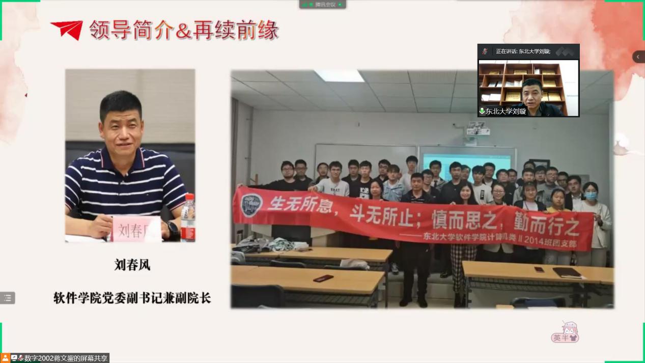 刘春风老师对接数字2002班,全程参与了班级的线上主题团日活动,并就同学们关心的职业规划发展等方面的问题进行细致的解答,同时鼓励同学们大胆尝、拓宽自己的视野,锻炼学习与创新能力。