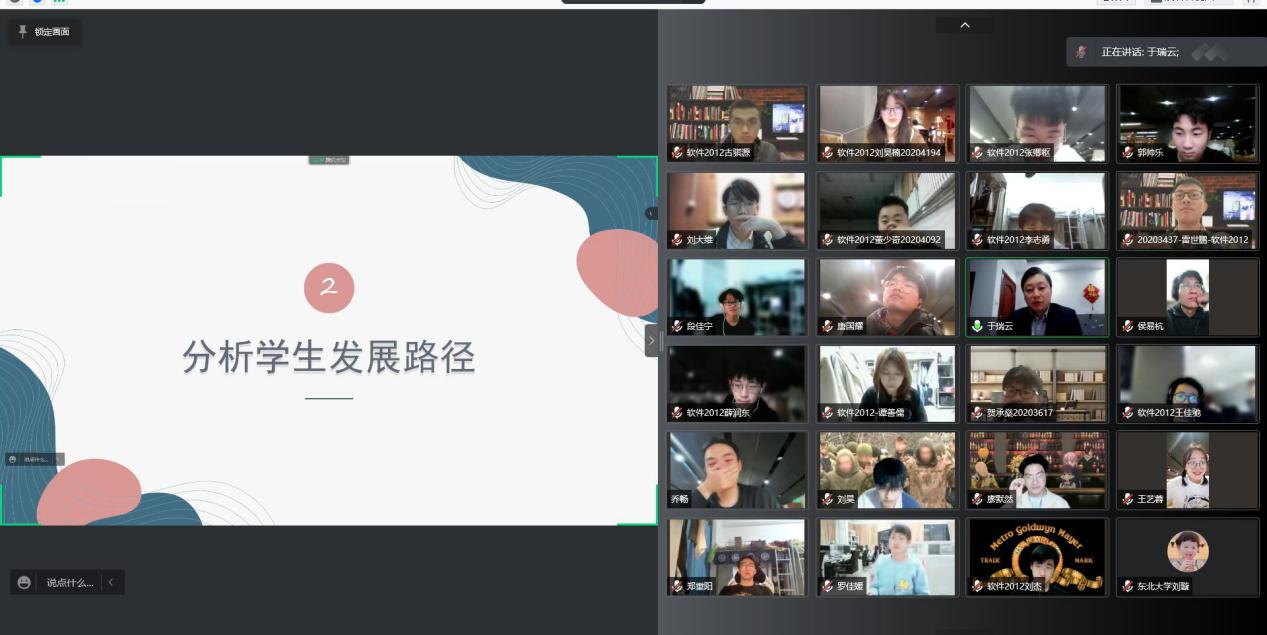 于瑞云老师对接软件2012班,根据学科优势和特点在竞赛和科研等方面给予了指导,鼓励学生们注重学用相长,培养创新精神和实践能力,并运用所学知识在未来报效祖国。