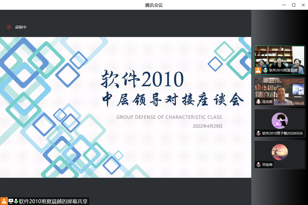 朱志良老师对接软件2010班,线上座谈中朱老师聆听了班级发展情况和班集体建设“五育”工程进展,就行业发展前景分析和个人发展规划目标设定等方面给出了建议,并鼓励同学们拓宽职业道路、加强职业修养。