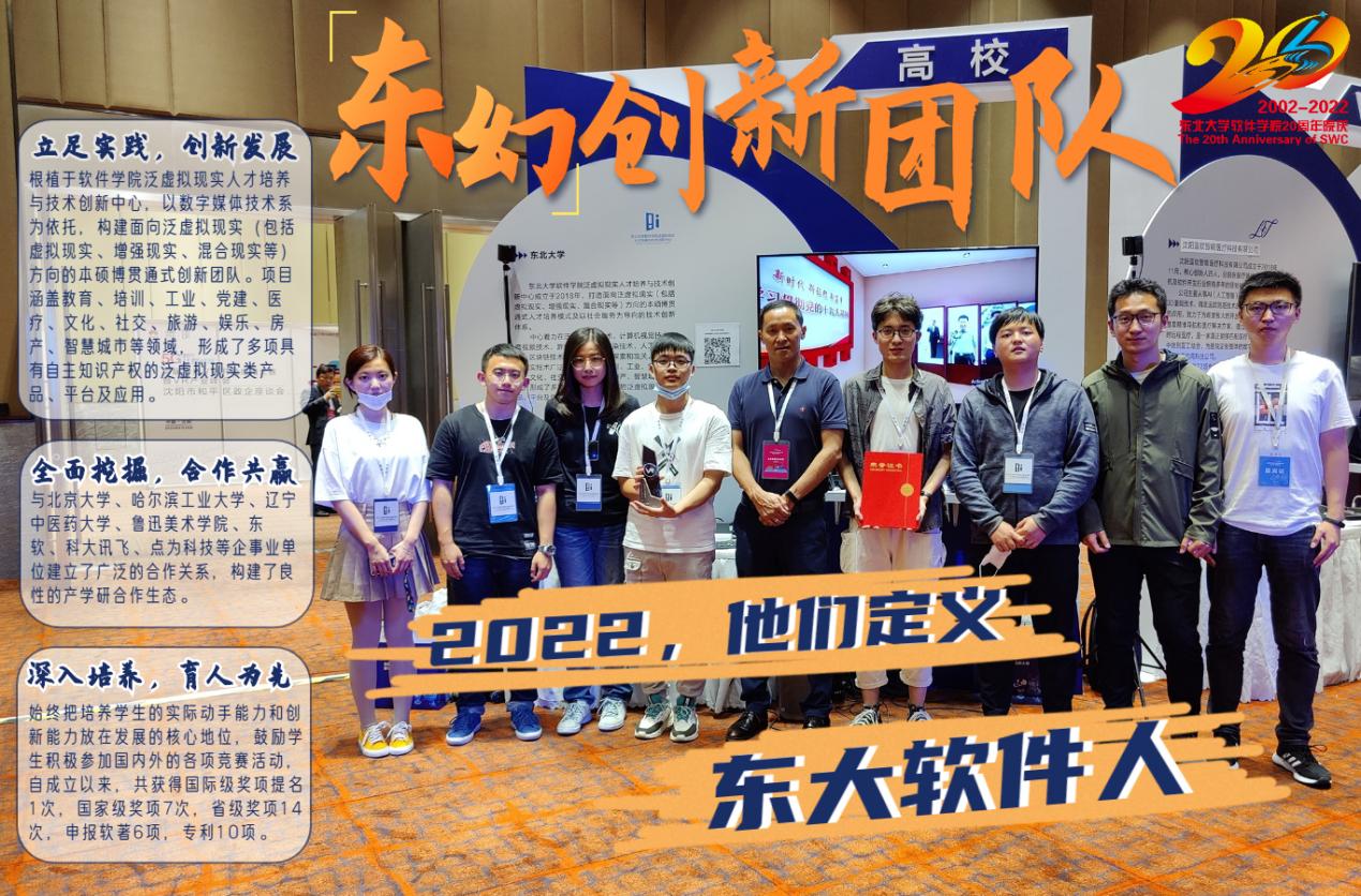 2018年,“东幻创新团队”正式成立,成立之初就入选了东北大学重点学生创新团队。团队成立后根植于东北大学软件学院泛虚拟现实人才培养与技术创新中心,以东北大学软件学院数字媒体技术系为依托,经过多年来的发展,现已构建了面向泛虚拟现实(包括虚拟现实、增强现实、混合现实等)方向的本硕博贯通式创新团队。在学校与学院的大力支持下,“东幻创新团队”从只有几个本科生的小团队发展为拥有指导教师5人,博士研究生8人,硕士研究生15人,本科生58人的研究队伍。团队全员参与实际项目,并形成了可操作、可演示的阶段性成果。项目涵盖教育、培训、工业、党建、医疗、文化、社交、旅游、娱乐、房产、智慧城市等领域,形成了多项具有自主知识产权的泛虚拟现实类产品、平台及应用。团队与北京大学、哈尔滨工业大学、辽宁中医药大学、鲁迅美术学院、东软、科大讯飞、点为科技等企事业单位建立了广泛的合作关系,构建了良性的产学研合作生态。