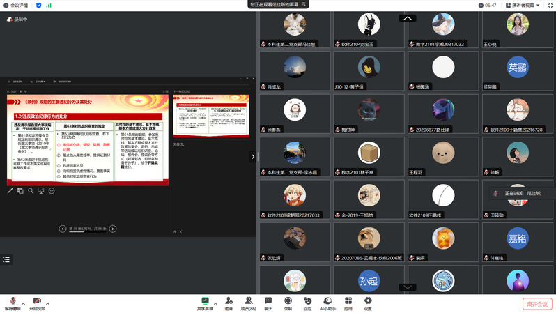5月21日,软件学院学生党总支组织全体校外学生党员开展线上党纪专题学习教育,学校党纪学习教育宣讲团成员、学院纪委书记任涛应邀授课,学院全体校外实习实训、留学交流的学生党员共计86人参加学习。
