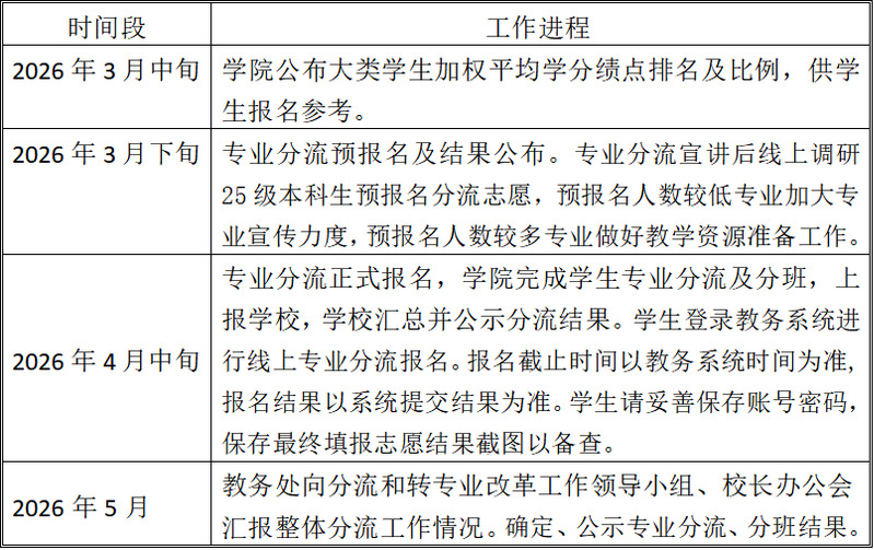 五、专业分流进程(具体进程安排以学校下发的分流时间安排为准)